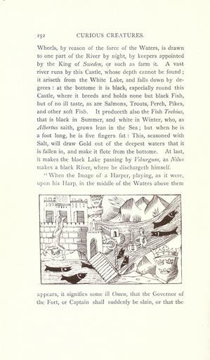 Keywords: Curious creatures in zoology (14948456623).jpg 2 5 2 <br> CURIOUS CREATURES <br> Wheels by reason of the force of the Waters is drawn <br> to one part of the River by night by keepers appointed <br> by the King of Sweden or such as farm it A vast <br> river runs by this Castle whose depth cannot be found ; <br> it ariseth from the White Lake and falls down by de- <br> grees at the bottome it is black especially round this <br> Castle where it breeds and holds none but black Fish <br> but of no ill taste as are Salmons Trouts Perch Pikes <br> and other soft Fish It produceth also the Fish Trcbius <br> that is black in Summer and white in Winter who as <br> Albertus saith grows lean in the Sea ; but when he is <br> a foot long he is five fingers fat This seasoned with <br> Salt will draw Gold out of the deepest waters that it <br> is fallen in and make it flote from the bottome At last <br> it makes the black Lake passing by Vibiirgum as Nilus <br> makes a black River where he dischargeth himself <br> When the Image of a Harper playing as it were <br> upon his Harp in the middle of the Waters above them <br> appears it signifies some ill Omen that the Governor of <br> the Fort or Captain shall suddenly be slain or that the 23575007 76213 32031 Page 252 Text http //www biodiversitylibrary org/page/23575007 1890 10 5962/bhl title 32031 Ashton John NameFound Albertus NameFound Nilus NameConfirmed Nilus EOLID 113018 NameBankID 4258720 Biodiversity Heritage Library Curious creatures in zoology; with 130 illus throughout the text Monsters Are Real Animals University of California Libraries archive org bhl page 23575007 dc identifier http //biodiversitylibrary org/page/23575007 bhlMonstersRreal Halloween university of california libraries archive org bhlmonstersrreal Information field Flickr posted date ISOdate 2014-10-19 CC-BY-2 0 BioDivLibrary https //flickr com/photos/61021753 N02/14948456623 2015-08-25 20 55 52 cc-by-2 0 PD-old-70-1923 Curious creatures in zoology Photos uploaded from Flickr by Fæ using a script |