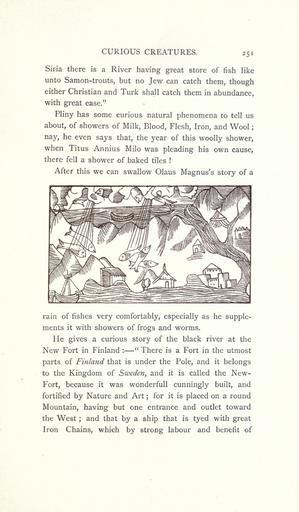 Keywords: Curious creatures in zoology (15569464892).jpg CURIOUS CREATURES 251 <br> Siria there is a River having great store of fish like <br> unto Samon-trouts but no Jew can catch them though <br> either Christian and Turk shall catch them in abundance <br> with great ease <br> Pliny has some curious natural phenomena to tell us <br> about of showers of Milk Blood Flesh Iron and Wool ; <br> nay he even says that the year of this woolly shower <br> when Titus Annius Milo was pleading his own cause <br> there fell a shower of baked tiles <br> After this we can swallow Olaus Magnus's story of a <br> rain of fishes very comfortably especially as he supple- <br> ments it with showers of frogs and worms <br> He gives a curious story of the black river at the <br> New Fort in Finland There is a Fort in the utmost <br> parts of Finland that is under the Pole and it belongs <br> to the Kingdom of Sweden and it is called the New- <br> Fort because it was wonderfull cunningly built and <br> fortified by Nature and Art ; for it is placed on a round <br> Mountain having but one entrance and outlet toward <br> the West ; and that by a ship that is tyed with great <br> Iron Chains which by strong labour and benefit of 23575006 76213 32031 Page 251 Text http //www biodiversitylibrary org/page/23575006 1890 10 5962/bhl title 32031 Ashton John NameFound Annius Biodiversity Heritage Library Curious creatures in zoology; with 130 illus throughout the text Monsters Are Real Animals University of California Libraries archive org bhl page 23575006 dc identifier http //biodiversitylibrary org/page/23575006 bhlMonstersRreal Halloween university of california libraries archive org bhlmonstersrreal Information field Flickr posted date ISOdate 2014-10-19 CC-BY-2 0 BioDivLibrary https //flickr com/photos/61021753 N02/15569464892 2015-08-25 20 53 54 cc-by-2 0 PD-old-70-1923 Curious creatures in zoology Photos uploaded from Flickr by Fæ using a script |