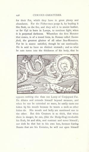 | Keywords: Curious creatures in zoology (15569457942).jpg 246 CURIOUS CREATURES <br> for their Fat which they have in great plenty and <br> abundance For the Fisher-men purge it by boyling it <br> like flesh on the fire and they sell it to anoint leather <br> or for Oyl to burn in Lamps to continue light when <br> it is perpetual darkness Wherefore the first Monster <br> that comes is of a round form in Norway called Swam- <br> fisck the greatest glutton of all other Sea-Monsters <br> For he is scarce satisfied though he eat continually <br> He is said to have no distinct stomach ; and so what <br> he eats turns into the thickness of his body that he <br> appears nothing else than one Lump of Conjoyned Fat <br> He dilates and extends himself beyond measure and <br> when he can be extended no more he easily casts out <br> fishes by his mouth because he wants a neck as other <br> fishes do His mouth and belly are continued one to <br> the other But this Creature is so thick that when <br> there is danger he can like the Hedg-Hog re-double <br> his flesh fat and skin and contract and cover himself; <br> nor doth he that but to his own loss because fearing <br> Beasts that are his Enemies he will not open himself 23575001 76213 32031 Page 246 Text http //www biodiversitylibrary org/page/23575001 1890 10 5962/bhl title 32031 Ashton John Biodiversity Heritage Library Leviathans Curious creatures in zoology; with 130 illus throughout the text Monsters Are Real Animals University of California Libraries archive org bhl page 23575001 dc identifier http //biodiversitylibrary org/page/23575001 bhlMonstersRreal Halloween leviathan university of california libraries archive org bhlmonstersrreal Information field Flickr posted date ISOdate 2014-10-19 CC-BY-2 0 BioDivLibrary https //flickr com/photos/61021753 N02/15569457942 2015-08-25 20 50 42 cc-by-2 0 PD-old-70-1923 leviathan Curious creatures in zoology Photos uploaded from Flickr by Fæ using a script |