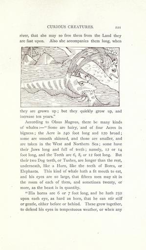 Keywords: Curious creatures in zoology (15382587117).jpg CURIOUS CREATURES 221 <br> river that she may so free them from the Land they <br> are fast upon Also she accompanies them long when <br> they are grown up ; but they quickly grow up and <br> increase ten years <br> According to Olaus Magnus there be many kinds <br> of whales Some are hairy and of four Acres in <br> bigness; the Acre is 240 foot long and 120 broad; <br> some are smooth skinned and those are smaller and <br> are taken in the West and Northern Sea ; some have <br> their Jaws long and full of teeth; namely 12 or 14 <br> foot long and the Teeth are 6 8 or 12 foot long But <br> their two Dog teeth or Tushes are longer than the rest <br> underneath like a Horn like the teeth of Bores or <br> Elephants This kind of whale hath a fit mouth to eat <br> and his eyes are so large that fifteen men may sit in <br> the room of each of them and sometimes twenty or <br> more as the beast is in quantity <br> His horns are 6 or 7 foot long and he hath 250 <br> upon each eye as hard as horn that he can stir stiff <br> or gentle either before or behind These grow together <br> to defend his eyes in tempestuous weather or when any 23574976 76213 32031 Page 221 Text http //www biodiversitylibrary org/page/23574976 1890 10 5962/bhl title 32031 Ashton John Biodiversity Heritage Library Leviathans Curious creatures in zoology; with 130 illus throughout the text Monsters Are Real Animals University of California Libraries archive org bhl page 23574976 dc identifier http //biodiversitylibrary org/page/23574976 bhlMonstersRreal Halloween leviathan university of california libraries archive org bhlmonstersrreal Information field Flickr posted date ISOdate 2014-10-19 CC-BY-2 0 BioDivLibrary https //flickr com/photos/61021753 N02/15382587117 2015-08-25 20 53 25 cc-by-2 0 PD-old-70-1923 leviathan Curious creatures in zoology Photos uploaded from Flickr by Fæ using a script |