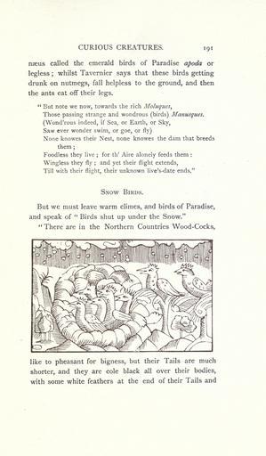 | Keywords: Curious creatures in zoology (15382561377).jpg  CURIOUS CREATURES 191 <br> naeus called the emerald birds of Paradise apoda or <br> legless ; whilst Tavernier says that these birds getting <br> drunk on nutmegs fall helpless to the ground and then <br> the ants eat off their legs <br> But note we now towards the rich Moluques <br> Those passing strange and wondrous birds Manueques <br> Wond'rous indeed if Sea or Earth or Sky <br> Saw ever wonder swim or goe or fly <br> None knowes their Nest none knowes the dam that breeds <br> them; <br> Foodless they live ; for th' Aire alonely feeds them <br> Wingless they fly ; and yet their flight extends <br> Till with their flight their unknown live's-date ends <br> SNOW BIRDS <br> But we must leave warm climes and birds of Paradise <br> and speak of Birds shut up under the Snow <br> There are in the Northern Countries Wood-Cocks <br> like to pheasant for bigness but their Tails are much <br> shorter and they are cole black all over their bodies <br> with some white feathers at the end of their Tails and 23574946 76213 32031 Page 191 Text http //www biodiversitylibrary org/page/23574946 1890 10 5962/bhl title 32031 Ashton John NameFound None NameConfirmed None EOLID 2913255 Biodiversity Heritage Library Curious creatures in zoology; with 130 illus throughout the text Monsters Are Real Animals University of California Libraries archive org bhl page 23574946 dc identifier http //biodiversitylibrary org/page/23574946 bhlMonstersRreal Halloween university of california libraries archive org bhlmonstersrreal Information field Flickr posted date ISOdate 2014-10-19 CC-BY-2 0 BioDivLibrary https //flickr com/photos/61021753 N02/15382561377 2015-08-25 21 52 31 cc-by-2 0 PD-old-70-1923 Curious creatures in zoology Photos uploaded from Flickr by Fæ using a script |