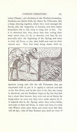 | Keywords: Curious creatures in zoology (15382559857).jpg CURIOUS CREATURES <br> 187 <br> hotter Climats ; yet oft-times in the Northern Countries <br> Swallows are drawn forth by chance by Fishermen like <br> a lump cleaving together where they went amongst the <br> Reeds after the beginning of Autumn and there fasten <br> themselves bill to bill wing to wing feet to feet For <br> it is observed that they about that time ending their <br> most sweet note do so descend and they fly out <br> peaceably after the beginning of the Spring and come <br> to their old Nests or else they build new ones by their <br> natural care Now that lump being drawn forth by <br> ignorant young men for the old Fishermen that are <br> acquainted with it put it in again is carryed and laid <br> on the Sea Shore and by the heat of the Sun the Lump <br> is dissolved and the Swallows begin to fly but they last <br> but a short time because they were not set at liberty by <br> being taken so soon but they were made captive by it <br> It hapneth also in the Spring when they return freely <br> and come to their old Nests or make new ones if a very <br> cold Winter come upon them and much snow fall they <br> will all dye ; that all that Summer you shall see none of 23574942 76213 32031 Page 187 Text http //www biodiversitylibrary org/page/23574942 1890 10 5962/bhl title 32031 Ashton John Biodiversity Heritage Library Curious creatures in zoology; with 130 illus throughout the text Monsters Are Real Animals University of California Libraries archive org bhl page 23574942 dc identifier http //biodiversitylibrary org/page/23574942 bhlMonstersRreal Halloween university of california libraries archive org bhlmonstersrreal Information field Flickr posted date ISOdate 2014-10-19 CC-BY-2 0 BioDivLibrary https //flickr com/photos/61021753 N02/15382559857 2015-08-25 21 53 29 cc-by-2 0 PD-old-70-1923 Curious creatures in zoology Photos uploaded from Flickr by Fæ using a script |