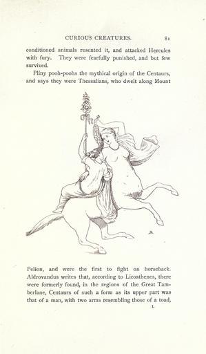 Keywords: Curious creatures in zoology (14947768464).jpg CURIOUS CREATURES <br> 81 <br> conditioned animals resented it and attacked Hercules <br> with fury They were fearfully punished and but few <br> survived <br> Pliny pooh-poohs the mythical origin of the Centaurs <br> and says they were Thessalians who dwelt along Mount <br> Pelion and were the first to fight on horseback <br> Aldrovandus writes that according to Licosthenes there <br> were formerly found in the regions of the Great Tam- <br> berlane Centaurs of such a form as its upper part was <br> that of a man with two arms resembling those of a toad 23574836 76213 32031 Page 81 Text http //www biodiversitylibrary org/page/23574836 1890 10 5962/bhl title 32031 Ashton John NameFound Aldrovandus NameFound Pelion NameConfirmed Pelion W F Kirby 1858 EOLID 20586 Biodiversity Heritage Library Curious creatures in zoology; with 130 illus throughout the text Monsters Are Real Animals University of California Libraries archive org bhl page 23574836 dc identifier http //biodiversitylibrary org/page/23574836 bhlMonstersRreal Halloween university of california libraries archive org bhlmonstersrreal Information field Flickr posted date ISOdate 2014-10-19 CC-BY-2 0 BioDivLibrary https //flickr com/photos/61021753 N02/14947768464 2015-08-25 21 53 20 cc-by-2 0 PD-old-70-1923 Curious creatures in zoology Photos uploaded from Flickr by Fæ using a script