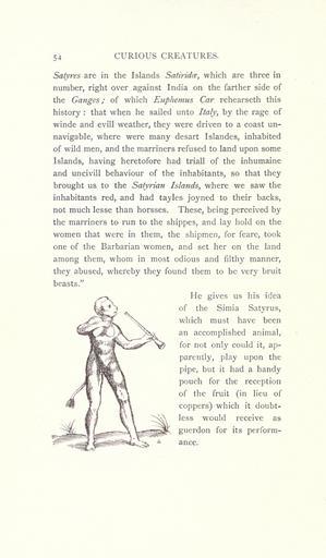 | Keywords: Curious creatures in zoology (15569345752).jpg 54 CURIOUS CREATURES <br> Satyrcs are in the Islands Satiridcc which are three in <br> number right over against India on the farther side of <br> the Ganges; of which Euphemus Car rehearseth this <br> history that when he sailed unto Italy by the rage of <br> winde and evill weather they were driven to a coast un- <br> navigable where were many desart Islandes inhabited <br> of wild men and the marriners refused to land upon some <br> Islands having heretofore had triall of the inhumaine <br> and uncivill behaviour of the inhabitants so that they <br> brought us to the Satyrian Islands where we saw the <br> inhabitants red and had tayles joyned to their backs <br> not much lesse than horsses These being perceived by <br> the marriners to run to the shippes and lay hold on the <br> women that were in them the shipmen for fearc took <br> one of the Barbarian women and set her on the land <br> among them whom in most odious and filthy manner <br> they abused whereby they found them to be very bruit <br> beasts <br> He gives us his idea <br> of the Simia Satyrus <br> which must have been <br> an accomplished animal <br> for not only could it ap- <br> parently play upon the <br> pipe but it had a handy <br> pouch for the reception <br> of the fruit in lieu of <br> coppers which it doubt- <br> less would receive as <br> guerdon for its perform- <br> ance 23574809 76213 32031 Page 54 Text http //www biodiversitylibrary org/page/23574809 1890 10 5962/bhl title 32031 Ashton John NameFound Euphemus NameConfirmed Euphemus NameBankID 4166117 NameFound Satyrus NameConfirmed Satyrus EOLID 11018434 NameBankID 113444 NameFound Simia NameConfirmed Simia NameBankID 113860 Biodiversity Heritage Library Curious creatures in zoology; with 130 illus throughout the text Monsters Are Real Animals University of California Libraries archive org bhl page 23574809 dc identifier http //biodiversitylibrary org/page/23574809 bhlMonstersRreal Halloween university of california libraries archive org bhlmonstersrreal Information field Flickr posted date ISOdate 2014-10-19 CC-BY-2 0 BioDivLibrary https //flickr com/photos/61021753 N02/15569345752 2015-08-25 21 51 35 cc-by-2 0 PD-old-70-1923 Curious creatures in zoology Photos uploaded from Flickr by Fæ using a script |