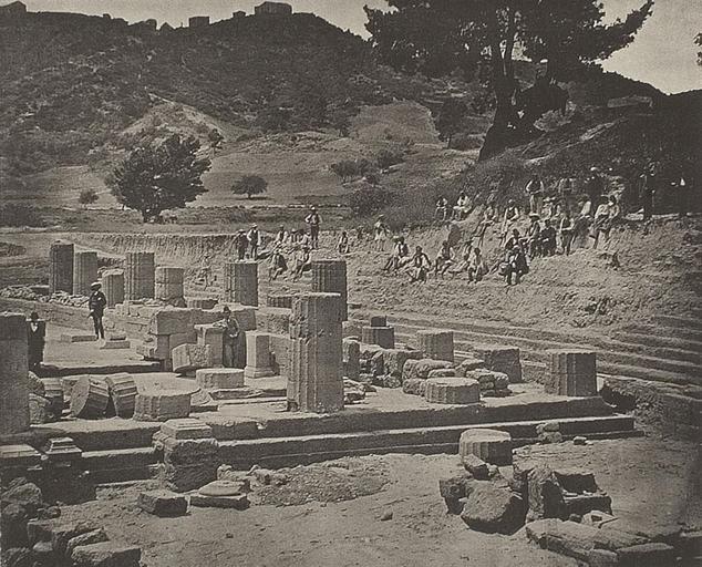 | Keywords: Curtius Olympia 3 t 02.jpg Das Heraion von Südosten gesehen Innerhalb desselben sind das grosse Bathron im Hintergrunde der Cella die Reste der Basis auf welcher einst der Hermes des Praxiteles stand der Südpfeiler der Eingangsthür und eine der späten Inschriftbasen des Pronaos durch Menschen markirt Im Vordergrunde stehen längs der Tempelfront mehre Marmorbasen aus römischer Zeit wie Höhenlage und Profil zu verrathen scheinen Links sieht man auf der südlichen Cellawand noch die Reste antiker wolgefügter Quadern In den Säulen der Südreihe Einschnitte zur Einfügung von Inschrifttafeln Davor durch Menschen markirt der Südostecke zunächst an der sich der Eingang zum Tempel befand ein quadratisch aus Ziegeln aufgemauertes und mit Marmorplatten ausgelegtes Bassin in dem einst das Marmorbecken eines Springbrunnens gestanden zu haben scheint welches auf unserer Photographie links ganz im Vordergrund am Erdabstiche sichtbar wird Weiterhin ein Bathron oder der Unterbau des Altars; im Hintergrunde das ringförmige Fundament des Philippeions Rechts im N des Heraions die zum Kronoshügel hinaufführende Stufenterrasse Ganz oben auf dem doppelten Gipfel des Hügels welcher die ganz Mitte des Hintergrundes einnimmt rechts das ždeutsche Haus für die Expeditionsmitglieder links die Kirche Hagios Georgios dazwischen einige Häuser des Dorfes Druwa Ernst Curtius Hg Die Ausgrabungen zu Olympia Band 3 à bersicht der Arbeiten und Funde vom Winter und Frühjahr 1877 “1878 Berlin 1877 http //diglit ub uni-heidelberg de/diglit/curtius1879bd3/0034 Digitalisat der Universitätsbibliothek Heidelberg 1877/1878 Gebr Romaïdis Patras PD-old Historical images of Olympia 1877/1878 excavations in Olympia Temple of Hera in Olympia |