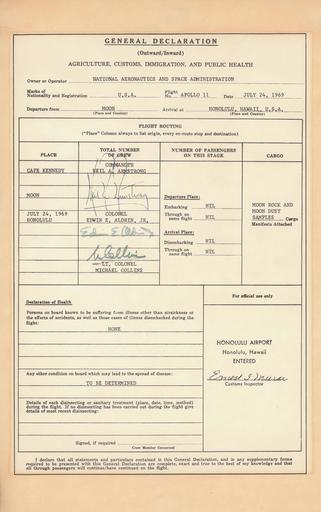 | Keywords: Customs and Immigration form signed by Apollo 11 astronauts after returning from the Moon.jpg Neil Armstrong Buzz Aldrin and Michael Collins jokingly filled out this customs-and-immigration form The form was posted on the official website of the United States Border Patrol in 2009 in honor of the 40th anniversary of the Moon landing <br>As a plaintext customs form it can be considered to fall below the threshold of originality; furthermore every component of the document -- including the signatures of Armstrong Aldrin and Collins -- was composed by employees of the United States Federal Government in the performance of their official duties NASA / U S Customs and Border Patrol retrieved from space com Neil Armstrong Buzz Aldrin Michael Collins 1969-07-24 Apollo 11 Neil Armstrong in 1969 19690724 Buzz Aldrin in 1969 19690724 Michael Collins astronaut U S Customs and Border Protection 1969 documents PD-USGov |