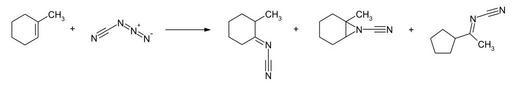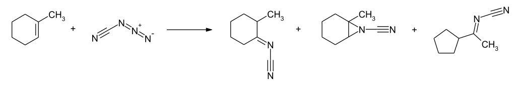 Keywords: Cyanogen azide reaction03.svg en Chemistry of cyanogen azide - dipolar addition to cyclohexene de Chemie des Cyanazides - dipolare Addition an Cyclohexen own Steffen 962 2015-01-22 PD-chem Cyanogen azide Cc-zero