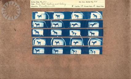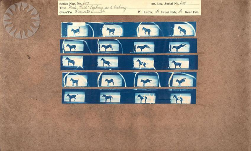 | Keywords: photography physics inventors muybridge smithsonian probably public domain probablypublicdomain SI Neg. 2004-41348. Date: na....Title: "Mule 'Ruth' bucking and kicking.".Series Neg. No. 657.An. Loc. Serial No. 659.Classification: "Domestic Animals.".Muybridge's cyanotypes are working proofs, the contact prints he made from more than 20,000 negatives he took at the University of Pennsylvania between 1884 and 1886 while photographing human and animal subjects in motion from lateral (parallel), front and rear positions. Since the original negatives no longer exist, the cyanotypes provide us with the opportunity to see the pictures Muybridge achieved before he edited and cropped them for publication..From the Photographic History Collection, National Museum of American History...Credit: Eadweard Muybridge (Smithsonian Institution) SI Neg. 2004-41348. Date: na....Title: "Mule 'Ruth' bucking and kicking.".Series Neg. No. 657.An. Loc. Serial No. 659.Classification: "Domestic Animals.".Muybridge's cyanotypes are working proofs, the contact prints he made from more than 20,000 negatives he took at the University of Pennsylvania between 1884 and 1886 while photographing human and animal subjects in motion from lateral (parallel), front and rear positions. Since the original negatives no longer exist, the cyanotypes provide us with the opportunity to see the pictures Muybridge achieved before he edited and cropped them for publication..From the Photographic History Collection, National Museum of American History...Credit: Eadweard Muybridge (Smithsonian Institution) |