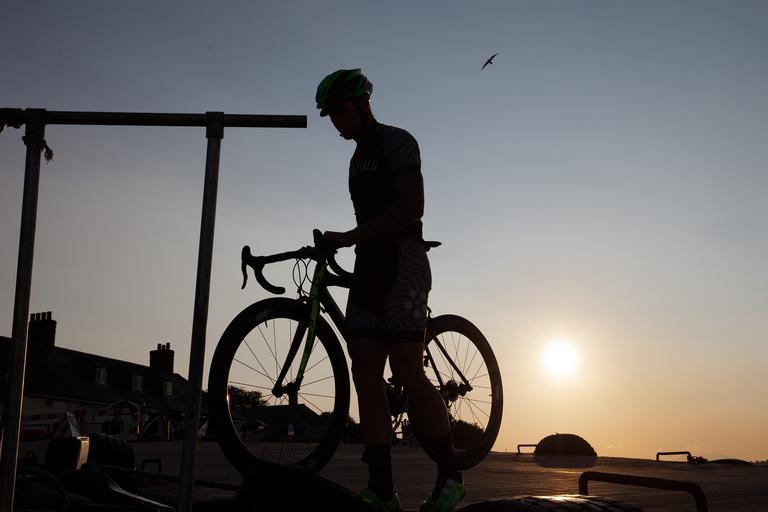 Keywords: cyclists silhouette outline helm sun road bike handrail enter ferry back light