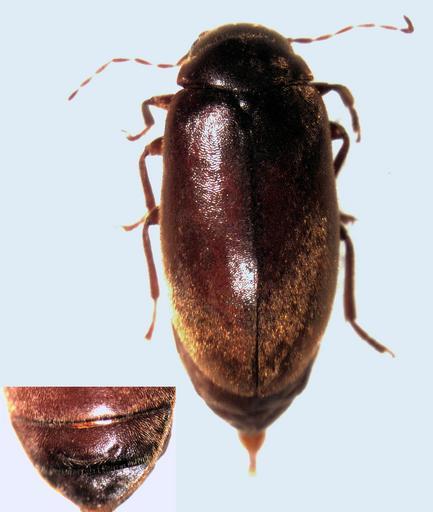 Keywords: Cyphanodes vestitus female.jpg en adult female Cyphanodes vestitus self-photographed S E Thorpe 2010-06-28 NEW ZEALAND WO Maungatautari South cell inside cell transect 2 pitfall trap I 20 Nov-17 Dec 2009 C H Watts Scirtidae
