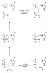 Keywords: Cysteinprotease Reaktionsmechanismus.svg Reaktionsmechanismus der Spaltung einer Peptidbindung durch eine Cystein-Proteaseen reaction mechanism of the cysteine protease-catalyzed cleavage of a peptide bond own 2007-03-20 NEUROtiker Own work all rights released Public domain remake of de Bild Cyteinproteasen jpg Hydrolases Peptide bond Enzyme mechanisms |
