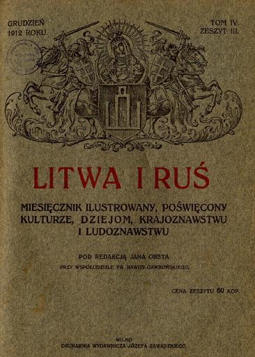 Keywords: Czasopis - Litwa i Rus - rok 1 - grudzien 1912 - T 4 - z 3.jpg en title page of Litwa i Rus magazine 1912 AD T 4 z 3 ru обложка жу нала Litwa i Rus 1912 г T 4 z 3 be вокладка часопіса Litwa i Rus 1912 г T 4 z 3 reproduction from title page of Litwa i Rus magazine 1912 AD T 4 z 3 editor Jan Obst 1912 AD public domain free Літва і Русь Литва и Русь Западный к ай западные губе нии Заходні к ай заходнія губе ні Western Krai PD-old |