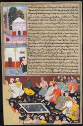 | Keywords: D3987191x.jpg A LEAF FROM THE RAZMNAMA Mughal India AH 1025/1616 AD Gouache heightened with gold on paper the feast at Hastinapura after the arrival of the white horse Krishna converses with Yudhishthira in a palace surrounded by courtiers and women with lines of black naskh above verso with full text page slight flaking lower edges defective Folio 13½ x 8¾in 35 x 22 5cm AH 1025/1616 AD Gouache heightened with gold on paper Folio 13½ x 8¾in 35 x 22 5cm object history credit line This leaf comes form a dispersed copy of the Razmnama an abridged Persian translation of the Hindu epic the Mahabharata which was originally commissioned for the Emperor Akbar in 1582 This copy was dated 1025/1616 It is illustrated in the Mughal style with strong Hindu tendencies The leading artist to work on this manuscript was Fazl He signed many of the miniatures and is known to have worked on other manuscripts produced outside the Mughal Court for 'Abdul Rahim Khan Khan Khanan an important patron of the day accession number A LEAF FROM THE RAZMNAMA Christie's online 3987191 http //67 52 109 59 8080/emuseum/view/objects/asitem/search 0040/74/title-asc/designation-asc t state flow 6d7f58ba-2a6c-4240-9432-e62414fc98d8 http //www harekrsna com/sun/features/05-10/features1740 htm PD-Art Uploaded with UploadWizard Razmnama |
