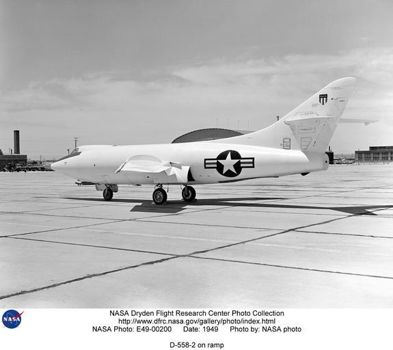 | Keywords: D-558-2 on ramp DVIDS731678.jpg en This 1949 NACA Muroc Flight Test Unit photograph shows the Douglas D-558-2 1 at the South Base Edwards Air Force Base The aircraft was turned over to the National Advisory Committee for Aeronautics on 31 August 1951 after completing the Douglas contractor test flights At this time the aircraft was only fitted with a jet engine Although given the call sign NACA 143 it was only flown once by the NACA on 17 September 1956 after being converted to all-rocket power The Douglas D-558-2 Skyrockets were among the early transonic research airplanes like the X-1 X-4 X-5 and X-92A Three of the single-seat swept-wing aircraft flew from 1948 to 1956 in a joint program involving the National Advisory Committee for Aeronautics NACA with its flight research done at the NACA's Muroc Flight Test Unit in Calif redesignated in 1949 the High-Speed Flight Research Station HSFRS ; the Navy-Marine Corps; and the Douglas Aircraft Co The HSFRS became the High-Speed Flight Station in 1954 and is now known as the NASA Dryden Flight Research Center The Skyrocket made aviation history when it became the first airplane to fly twice the speed of sound The 2 in the aircraft's designation referred to the fact that the Skyrocket was the phase-two version of what had originally been conceived as a three-phase program with the phase-one aircraft having straight wings The third phase which never came to fruition would have involved constructing a mock-up of a combat-type aircraft embodying the results from the testing of the phase one and two aircraft Douglas pilot John F Martin made the first flight at Muroc Army Airfield later renamed Edwards Air Force Base in Calif on February 4 1948 The goals of the program were to investigate the characteristics of swept-wing aircraft at transonic and supersonic speeds with particular attention to pitch-up uncommanded rotation of the nose of the airplane upwards --a problem prevalent in high-speed service aircraft of that era particularly at low speeds during take-off and landing and in tight turns The three aircraft gathered a great deal of data about pitch-up and the coupling of lateral yaw and longitudinal pitch motions; wing and tail loads lift drag and buffeting characteristics of swept-wing aircraft at transonic and supersonic speeds; and the effects of the rocket exhaust plume on lateral dynamic stability throughout the speed range Plume effects were a new experience for aircraft The number three aircraft also gathered information about the effects of external stores bomb shapes drop tanks upon the aircraft's behavior in the transonic region roughly 0 7 to 1 3 times the speed of sound In correlation with data from other early transonic research aircraft such as the XF-92A this information contributed to solutions to the pitch-up problem in swept-wing aircraft The three airplanes flew a total of 313 times--123 by the number one aircraft Bureau No 37973--NACA 143 103 by the second Skyrocket Bureau No 37974--NACA 144 and 87 by airplane number three Bureau No 37975--NACA 145 Skyrocket 143 flew all but one of its missions as part of the Douglas contractor program to test the airplane's performance NACA aircraft 143 was initially powered by a Westinghouse J-34-40 turbojet engine configured only for ground take-offs but in 1954-55 the contractor modified it to an all-rocket air-launch capability featuring an LR8-RM-6 4-chamber Reaction Motors engine rated at 6 000 pounds of thrust at sea level the Navy designation for the Air Force's LR-11 used in the X-1 In this configuration NACA research pilot John McKay flew the airplane only once for familiarization on September 17 1956 The 123 flights of NACA 143 served to validate wind-tunnel predictions of the airplane's performance except for the fact that the airplane experienced less drag above Mach 0 85 than the wind tunnels had indicated NACA 144 also began its flight program with a turbojet powerplant NACA pilots Robert A Champine and John H Griffith flew 21 times in this configuration to test airspeed calibrations and to research longitudinal and lateral stability and control In the process during August of 1949 they encountered pitch-up problems which NACA engineers recognized as serious because they could produce a limiting and dangerous restriction on flight performance Hence they determined to make a complete investigation of the problem In 1950 Douglas replaced the turbojet with an LR-8 rocket engine and its pilot William B Bridgeman flew the aircraft seven times up to a speed of Mach 1 88 1 88 times the speed of sound and an altitude of 79 494 feet the latter an unofficial world's altitude record at the time achieved on August 15 1951 In the rocket configuration a Navy P2B Navy version of the B-29 launched the airplane at approximately 30 000 feet after taking off from the ground with the Skyrocket attached beneath its bomb bay During Bridgeman's supersonic flights he encountered a violent rolling motion known as lateral instability that was less pronounced on the Mach 1 88 flight on August 7 1951 than on a Mach 1 85 flight in June when he pushed over to a low angle of attack angle of the fuselage or wing to the prevailing wind direction The NACA engineers studied the behavior of the aircraft before beginning their own flight research in the airplane in September 1951 Over the next couple of years NACA pilot A Scott Crossfield flew the airplane 20 times to gather data on longitudinal and lateral stability and control wing and tail loads and lift drag and buffeting characteristics at speeds up to Mach 1 878 At that point Marine Lt Col Marion Carl flew the airplane to a new unofficial altitude record of 83 235 feet on August 21 1953 and to a maximum speed of Mach 1 728 Following Carl's completion of these flights for the Navy NACA technicians at the High-Speed Flight Research Station HSFRS near Mojave Calif outfitted the LR-8 engine's cylinders with nozzle extensions to prevent the exhaus