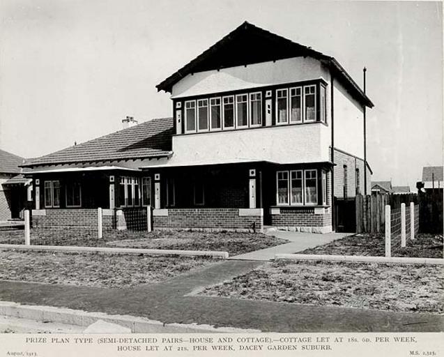 | Keywords: archives state records nsw staterecordsnsw newsouthwales blackandwhite daceyville suburb garden suburb gardensuburb sydney houses federation style federationstyle public housing publichousing architecture building outdoor black and white Prize plan type (semi-detached pairs - house and cottage). Cottage let at 18s [shillings] 6D [pence] per week, house let at 21s [shillings] per week, Dacey Garden suburb Dated: 1913 Digital ID: 5225_a018_a018000027 Rights: www.records.nsw.gov.au/about-us/rights-and-permissions We'd love to hear from you if you use our photos. From a series of photographs of 'Dacey Garden Suburb' (Daceyville) - a development by the Housing Board of NSW as Sydney's "first planned modern garden suburb". Daceyville was developed between 1913 and 1918 and is located in south-eastern Sydney within the municipalities of Mascot and Botany. The images in the series show scenes of the area before development, road building, the types of houses built, shops, as well as the Public School. The suburb was named after the state parliamentarian John Rowland Dacey who played a vital role in the approval of this urban development. Many other photos in our collection are available to view and browse on our website using Photo Investigator. Prize plan type (semi-detached pairs - house and cottage). Cottage let at 18s [shillings] 6D [pence] per week, house let at 21s [shillings] per week, Dacey Garden suburb Dated: 1913 Digital ID: 5225_a018_a018000027 Rights: www.records.nsw.gov.au/about-us/rights-and-permissions We'd love to hear from you if you use our photos. From a series of photographs of 'Dacey Garden Suburb' (Daceyville) - a development by the Housing Board of NSW as Sydney's "first planned modern garden suburb". Daceyville was developed between 1913 and 1918 and is located in south-eastern Sydney within the municipalities of Mascot and Botany. The images in the series show scenes of the area before development, road building, the types of houses built, shops, as well as the Public School. The suburb was named after the state parliamentarian John Rowland Dacey who played a vital role in the approval of this urban development. Many other photos in our collection are available to view and browse on our website using Photo Investigator. |