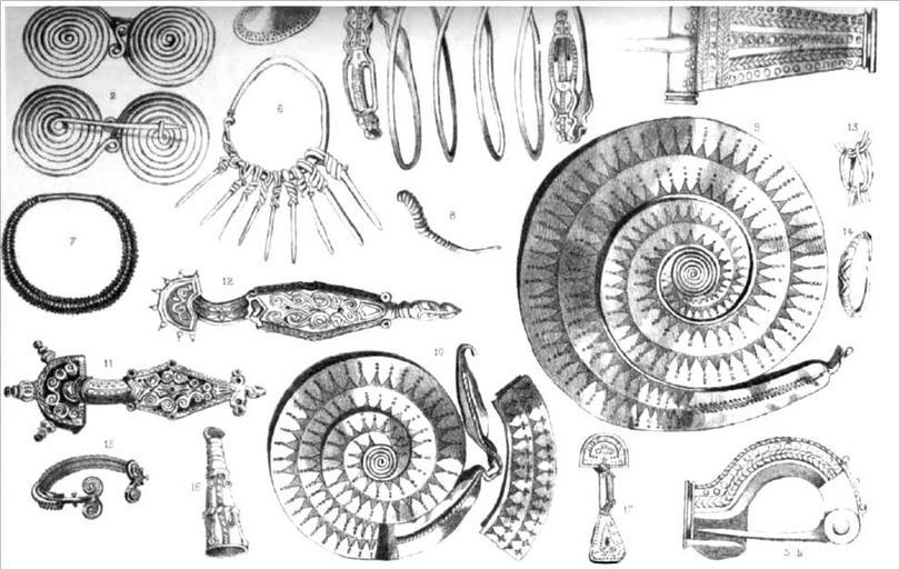 | Keywords: Dacian silver and gold objects (pre-Roman Dacia).JPG en Dacian silver and gold objects 1 Fibula Orăştie German Broos Hungarian Szászváros - Hunedoara County 2 fibula Orăştie German Broos Hungarian Szászváros Hunedoara County 3 Gold Tufalau Covasna 4 Silver bracelet Hetur Tarnava Mica Siviu 5a and 5b Golden fibula 6 Silver Somesul Cald 7 Gold torque Sarasau Maramures 8 Gold Bardotiu Transylvania 9 Golden coils Sarasau Maramures 10 Golden coils SarasauMaramures 11 Silver fibula with gold cover Seica Mica Sibiu 12 Silver fibula with gold cover Seica Mica Sibiu 13 Silver chain Somes cald 14 Golden earrings Bardotiu 15 Golden bracelet Åžimleu Silvaniei Hungarian Szilágysomlyó German Schomlenmarkt 16 Golden object Orsiova 17 Fibula with spring Seica Mica Sibiu These images had been included by Tocilescu in his thesis Dacia inainte de Romani 'Dacia before Romans published in 1877 in Annals of the Romanian Academic Society Dacia inainte de Romani 'Dacia before Romans published in 1877 in Annals of the Romanian Academic Society Bucharest Romania to Tocilescu Grigore George 26 October 1850 “ 18 September 1909 1877 PD-old Tocilescu Grigore George 26 October 1850 “ 18 September 1909 was a Romanian historian archaeologist epigrapher and folkorist member of Romanian Academy His thesis Dacia inainte de Romani 'Dacia before Romans published in 1877 in Annals of the Romanian Academic Society Ragguagli de' lavori accademici per l'anno 1826 -1830 Societa reale borbonica Annalele Societatii Academice Romane at Bucuresci Bucharest Romania PD-old-100 ImageNote 1 526 213 17 186 972 615 2 Dacian civilization is quite well represented by spiral details at almost every level of craftsmanship Though discovered evidence is scarce most are golden artifacts who conceptualize the spiral as a reference ImageNoteEnd 1 Dacian bracelets Dacia Dacians Prehistoric Romania Orăștie Grigore Tocilescu |