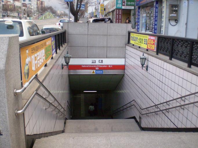 | Keywords: Daegu Gyodae station entrance.jpg Entrance to the Daegu National University of Education subway station Line 1 in Daegu South Korea Own 2007-01-28 Taken by User Visviva and released into the public domain Daegu Metro Line 1 Stations of DTRO Train stations in Daegu Nam-gu Daegu Railway stations opened in 1997 |