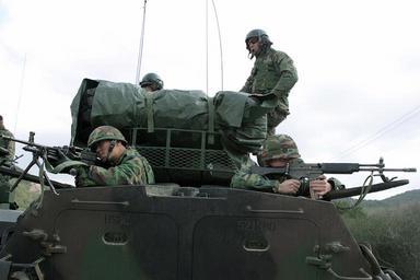 | Keywords: Daewoo K2 K3 DM-SD-06-11424.JPEG US Marine Corps USMC Lance Corporal LCPL Anthony Bittle background right assigned to the 3rd Light Armored Reconnaissance Battalion LARB stands on top of his Light Armored Vehicle LAV-25 and observes as Republic of Korea KOR Marine Private First Class PFC Sung-Il foreground left mans a Daewoo 5 56 mm K3 light machine gun and KOR Corporal CPL Park Sung-Wo mans a Daewoo 5 56 mm K2 assault rifle during training at Su Song Ri Republic of Korea KOR while participating in the Amphibious Ready Group Exercise 2004 ARGEX 04 The Exercise is jointly conducted between the USMC and the US Navy USN and the KOR and is designed to familiarize each Unit with the techniques tactics and procedures associated with a Special Operations Capable SOC Unit source http //www dodmedia osd mil/DVIC_View/Still_Details cfm SDAN DMSD0611424 JPGPath /Assets/Still/2006/Marines/DM-SD-06-11424 JPG DODmedia PD-USGov Republic of Korea Marine Corps Daewoo K2 Daewoo K3 3rd Light Armored Reconnaissance Battalion United States |