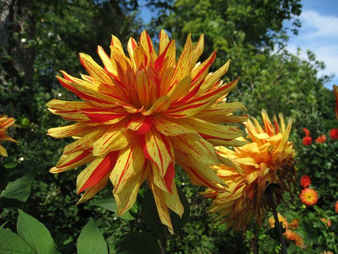 Keywords: dahlia two tone summer yellow orange foliage green sky blue