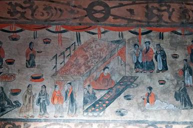 Keywords: Dahuting tomb banquet scene, mural detail, Eastern Han Dynasty.jpg en The Dahuting Tomb Chinese 打虎亭汉墓 Pinyin Dahuting Han mu; Wade-Giles Tahut'ing Han mu of the late Eastern Han Dynasty 25-220 AD located in Zhengzhou Henan province China was excavated in 1960-1961 and contains vault-arched burial chambers decorated with murals showing scenes of daily life <br>For further information see the Baidu article in Chinese http //baike baidu com/view/230941 htm 打虎亭汉墓 <br>http //blog sina com cn/s/blog_53928e100102voyg html Click here for more pictures and a step-by-step walkthrough of the tomb from the outside down a stairwell and through the vaulted burial chambers Late 2nd early 3rd century AD http //news sina com cn/c/2004-08-25/08044129741 shtml News sina com cn<br> http //www zzldcn cn/Panoramic/Pages/91_1621 html Zzldcn cn National Cultural Information Resources Sharing Project Zhengzhou Branch<br> http //bbs photofans cn/blog php mod view_mob id 56507 Bbs photofans cn<br> https //www synotrip com/henan-province/sky-han/dahuting-han-dynasty-tombs Synotrip com Henan Province<br> https //www tripadvisor com/LocationPhotoDirectLink-g1152494-d1834409-i158766092-Dahuting_Tomb_of_Han_Dynasty-Xinmi_Henan html Tripadvisor com<br> Ancient Chinese artists of the late Eastern Han period other versions Custom license marker 2016 10 11 PD-Art-100 Dahuting Tomb murals Banquets in art |