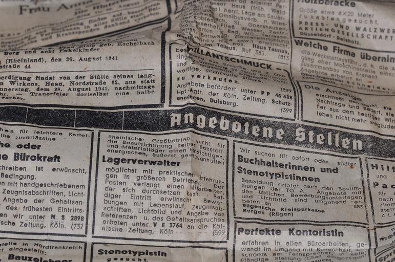 Keywords: daily newspaper newspaper newsprint paper pressure font printing font old script antique old information crumpled pages output close transience texture