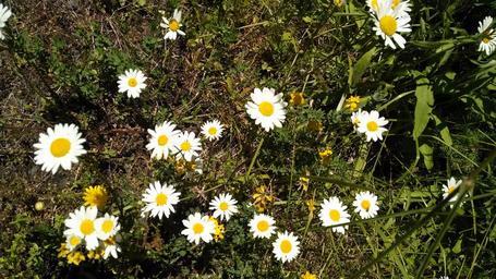 Keywords: daisies flowers green spring daisy nature floral blossom white yellow plant bright natural petal fresh spring flower vibrant