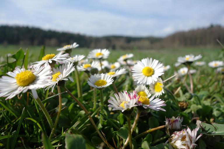Keywords: daisy meadow flower meadow field panorama spring meadow blue bloom fields grass blades of grass sunny