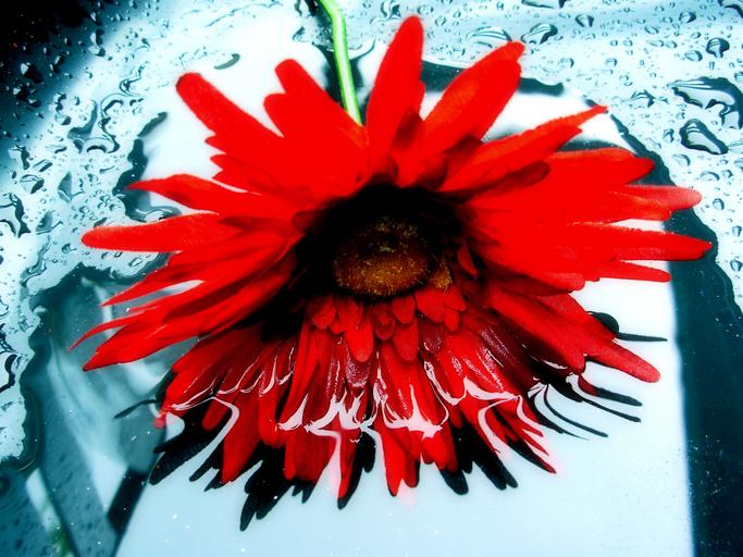 Keywords: daisy reflection floral red flower water drops surface mirror