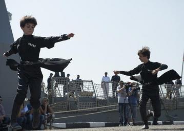 Keywords: Dancers perform aboard USS Bulkeley 130810-N-IG780-166.jpg en Georgian boys perform a traditional dance to welcome the guided missile destroyer USS Bulkeley DDG 84 to Batumi Georgia Aug 10 2013 The Bulkeley part of the Harry S Truman Carrier Strike Group was supporting maritime security operations and theater security cooperation efforts in the U S 6th Fleet area of responsibility U S Navy photo by Mass Communication Specialist 3rd Class Shane A Jackson/Released 2013-08-10 Petty Officer 3rd Class Shane Jackson https //www dvidshub net/image/1005465 130810-N-IG780-166 2013-08-29 02 26 BATUMI GE PD-USGov-Military-Navy USS Bulkeley DDG-84 Images from DoD uploaded by Fæ |