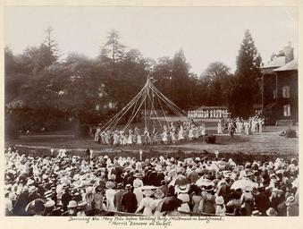 | Keywords: cymru wales llyfrgell genedlaethol cymru llyfrgellgenedlaetholcymru national library of wales nationallibraryofwales abery, p. b. (1877?-1948) aberypb18771948 jones, wallace joneswallace historical pageants historicalpageants builth wells (wales) builthwellswales llanfair-ym-muallt llanfairymmuallt photographic prints photographicprints costumes impersonation may poles maypoles dance rites & ceremonies ritesceremonies group portraits groupportraits spectators clothing & dress clothingdress maypole dancing maypoledancing white dresses whitedresses morris dancers morrisdancers outdoor snow Ffotograffydd/Photographer: P. B. Abery (1877?-1948) &amp; Wallace Jones Dyddiad/Date: 11th August 1909 Cyfrwng/Medium: Photographic print  Cyfeiriad/Reference: pba02016 Rhif cofnod / Record no.: 3590090  This image is taken from the Builth Wells Historical Pageant photograph album, which includes approximately 160 photographs, newspaper cuttings and other ephemera of the majestic pageant which was performed at the grounds of Llanelwedd Hall on 11 August 1909. The photographs were taken by P B Abery and Wallace Jones. The pageant was an epic production. According to a transcript included in the album, it took a year to prepare, over a 1000 people took part in the event, and it is reported to have been witnessed by a crowd of around 5000.   Daw'r ffotograff yma o lyfr ffoto Pasiant Llanfair ym Muallt,  sy'n cynnwys tua 160 o ffotograffau, toriadau’r wasg ac effemera sy’n ymwneud â’r pasiant mawreddog a berfformiwyd ar faes Neuadd Llanelwedd ar 11 Awst 1909. Tynnwyd y ffotograffau gan P B Abery a Wallace Jones. Roedd y pasiant yn ddigwyddiad ysblennydd. Yn ôl adysgrif sydd wedi ei chynnwys yn yr albwm, cymerodd flwyddyn i baratoi’r digwyddiad, bu 1000 o bobl yn rhan o’r paratoadau, ac adroddir fod tyrfa o tua 5000 yn ei wylio.   Rhagor o wybodaeth am gasgliad P B Abery yn Llyfrgell Genedlaethol Cymru  More information about the P B Abery Collection at the National Library of Wales Ffotograffydd/Photographer: P. B. Abery (1877?-1948) & Wallace Jones Dyddiad/Date: 11th August 1909 Cyfrwng/Medium: Photographic print  Cyfeiriad/Reference: pba02016 Rhif cofnod / Record no.: 3590090  This image is taken from the Builth Wells Historical Pageant photograph album, which includes approximately 160 photographs, newspaper cuttings and other ephemera of the majestic pageant which was performed at the grounds of Llanelwedd Hall on 11 August 1909. The photographs were taken by P B Abery and Wallace Jones. The pageant was an epic production. According to a transcript included in the album, it took a year to prepare, over a 1000 people took part in the event, and it is reported to have been witnessed by a crowd of around 5000.   Daw'r ffotograff yma o lyfr ffoto Pasiant Llanfair ym Muallt,  sy'n cynnwys tua 160 o ffotograffau, toriadau’r wasg ac effemera sy’n ymwneud â’r pasiant mawreddog a berfformiwyd ar faes Neuadd Llanelwedd ar 11 Awst 1909. Tynnwyd y ffotograffau gan P B Abery a Wallace Jones. Roedd y pasiant yn ddigwyddiad ysblennydd. Yn ôl adysgrif sydd wedi ei chynnwys yn yr albwm, cymerodd flwyddyn i baratoi’r digwyddiad, bu 1000 o bobl yn rhan o’r paratoadau, ac adroddir fod tyrfa o tua 5000 yn ei wylio.   Rhagor o wybodaeth am gasgliad P B Abery yn Llyfrgell Genedlaethol Cymru  More information about the P B Abery Collection at the National Library of Wales  <b>Ffotograffydd/Photographer:</b> P. B. Abery (1877?-1948) & Wallace Jones