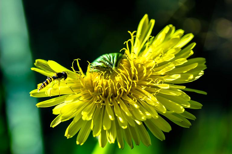 Keywords: dandelion common dandelion flower pointed flower half open open wild flower plant garden schwebefliege in anflug insect scavenge nectar search