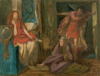 Keywords: Dante Gabriel Rossetti - The Return of Tibullus to Delia (1853 circa).jpg Artwork Creator Dante Gabriel Rossetti en Rossetti depicts the passage in Tibullus Elegies I 3 82-92 when Tibullus bids to his mistress to await his return <br /> 'Live chaste dear love; and while I'm far away <br /> Be some old dame thy guardian night and day <br /> She'll sing thee songs and when the lamp is lit <br /> Fly the full rock and draw long threads from it <br /> So unannouced shall I come suddenly <br /> As 'twere a presence sent from heaven to thee <br /> Then as thou art all long and loose they hair <br /> Run to me Delia run with thy feet bare ' ~ 1853 Technique watercolour gouache artist's board in 9 5 12 Institution Private collection place of discovery object history Fanny Cornforth <br /> possibly bought by Fairfax Murray circa 1907 <br /> Siddons Gallery Paddington Green <br /> Terence W G Rowe Collection bought in 1956 <br /> The Stone Gallery Newcastle -upon-Tyne <br /> Sotheby's exhibition history London Rossetti Gallery no 10 <br /> London Leighton Art Gallery The Pre-Raphaelite Influence 1960 no 71 <br /> London The Royal Academy of Arts Rossetti Exhibition 1973 no 252 credit line DGR 1851 artist's monogram/date lower right ~ written in an unidentified hand Titled and inscribed with eight lines in Latin from Tibullus on the reverse accession number place of creation http //www sothebys com/en/auctions/ecatalogue/2003/the-collecting-eye-of-seymour-stein-n07933/lot 6 html Sotheby's New York 11 December 2003 lot 6 Dante Gabriel Rossetti - The Return of Tibullus to Delia 1853 circa jpg Dante Gabriel Rossetti - The Return of Tibullus to Delia 1867 jpg Dante Gabriel Rossetti - The Return of Tibullus to Delia 1868 jpg http //www rossettiarchive org/docs/s62 rap html Rossetti Archive Custom license marker 2016 05 07 PD-old-auto-1923 1882 Images from Sotheby's Paintings by Dante Gabriel Rossetti Tibullus Ancient Rome in history paintings 1850s watercolor paintings 1850s paintings in private collections |