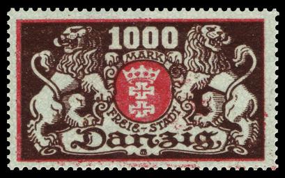 | Keywords: Danzig 1923 121 großes Staatswappen.jpg / Briefmarkenbeschreibung Dauermarkenserie Definitive stamp series Ausgabepreis 1000 Mark First Day of Issue / Erstausgabetag 24 Januar 1923 Michel-Katalog-Nr 121 Danzig scanned by NobbiP 2011-09-30 Buchholz PD-old-auto-1996 1944 PL <gallery> File Danzig 1923 119 großes Staatswappen jpg 1923 119 File Danzig 1923 120 großes Staatswappen jpg 1923 120 File Danzig 1923 122 großes Staatswappen jpg 1923 122 </gallery> Philately großes Staatswappen mit 2 flankierenden Löwen Nennwert 1000 Mark 1923-01-24 Buchholz 768 100 Buchdruck 121 Danzig Coats of arms of Gdańsk on stamps 1923 stamps of the Free City of Danzig German stamps review keep Max Buchholz |