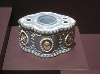 | Keywords: DAR pot - IMG 8550.JPG Inkwell jasper ware; Daniel Steele Staffordshire circa 1790 Pottery exhibited in the DAR Museum National Society Daughters of the American Revolution 1776 D Street NW Washington DC USA I took this photograph 2011-01-18 13 17 39 Daderot Public domain Pottery in the DAR Museum Inkwells |