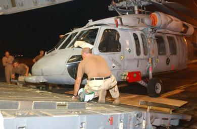 Keywords: Darryll Connor Loads an MH-60 Helicopter Onto a U.S. Air Force C-17 DVIDS11323.jpg en MANAMA Bahrain -- Aviation Maintenance Administrationman First Class Darryll Connor a native of Missoula Mo loads an MH-60 helicopter onto a U S Air Force C-17 in Bahrain Oct 15 for transport to Pakistan The helo and members of Connor's squadron will help deliver medical supplies water and tents to earthquake victims to support the government of Pakistan's relief efforts Helicopter Sea Combat Squadron 26 HSC 26 provides logistic support to naval assets deployed in the North Arabian Gulf In addition to providing support as part of maritime security operations in the region the squadron will deploy 25 sailors and two MH-60s helicopters to help those in need in Pakistan U S Navy photo by Photographer's Mate second Class Kim Bennett 2005-10-14 https //www dvidshub net/image/11323 11323 2005-10-16 15 05 MANAMA BH PD-USGov Manama Images from DoD uploaded by Fæ People from Missoula Montana |