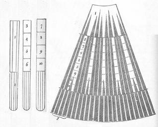| Keywords: Das Ganze der Kürschnerei, Paul Cubäus, Alexander Tuma, 1. Auflage ( Fig. 25, S. 296), Das Galonieren.jpg Technical book for Furriers Paul Cubaeus Das Ganze der Kürschnerei Gründliches Lehrbuch alles Wissenswerthen über Waarenkunde Zurichterei Färberei und Verarbeitung der Pelzfelle Erste Auflage Wien Pest Leipzig 1891 Seite 296 Fig 25 Fig 22 stellt einen Zobelschweif dar Man schneidet unten circa 1½ bis 2 <sup>c</sup>/m die Spitze dann oben an der Wurzel rechts und links die wilden Haare ab Die Spitzen kann man unten an Boas Besätzen Krägen 18px wo die Schweifspitze den Schluß bildet verwenden; bei Muffen muß sie abgeschnitten werden weil der Schweif sonst zu sehr absticht Hierauf theilt man den Schweif in der Breite in vier Theile die zwei mittelsten bleiben soweit der Schweif egal breit ist beisammen nur unten wo er schmäler wird setzt man ein schräges Stückchen Galon Fig 22 ein Die zwei Streifen an den Seiten werden eingeschnitten und mit 6 <sup>m</sup>/m breitem Galon versehen an einer Seite kommt 1 <sup>c</sup>/m breit Galon Auf diese Weise bereitet man vor zu Boas und Muffen Bei Boas nimmt man gewöhnlich zwei Schweife nebeneinander und muß auch beim Sortieren dafür sorgen daß oben etwas heller raucher unten etwas dunklere flachere genommen werden damit die Boa nach unten etwas spitzer verläuft Bei Muffen nimmt man je nach der Größe des Muffs vier Höhen übereinander und 5-7 Schweife nebeneinander Die größte Sorgfalt ist darauf zu achten daß die einzelnen Schweife sowie die Galons genau aufeinander passend gesetzt werden Verschönern kann man die Arbeit wenn man zwei Schweife in der Länge mit einander versetzt so daß sie einen doppellangen bilden Man vermeidet auf diese Weise die Abstufung in der Farbe Wie in Figur 23 theilt man jeden Schweif in der Länge in sechs Theile und setzt dieselben übereinander wie angegeben Diese Eintheilung wird vorher durch Bleistiftstriche markirt dann zuerst die Galons eingeschnitten dann erst die Querschnitte gemacht versetzt zusammengenäht und die Galons eingesetzt Schwieriger wird die Arbeit des Versetzens der Schweife wenn man Pelerinen oder Besätze welche nach unten breiter auslaufen aus Schweifen zu fertigen hat In welcher Weise diese Arbeit auszuführen ist hängt von der Länge der Pelerine sowie der Schweife ab Aus Fig 24 ist ersichtlich daß man am besten oben einen Aufsatz von halben Schweifen macht die man auch nur nach unten zu galoniert um sie keilförmig zu machen und die untere Hälfte bei welcher man dann auch die äußerste Schweifspitze nicht abschneidet zum Einsetzen zu benutzen damit die Pelerine nach unten die verlangte Weite bekommt Figur zeigt einen Abschnitt der Pelerine die nur so hoch ist daß 1½ Schweifhöhe genügen Fig 25 ist auf drei Schweifhöhen berechnet und nach unten weiter die unteren Schweife sind versetzt bis zur Hälfte dann abgeschnitten und aus der unteren Hälfte der Schweife welche der dunkleren Färbung wegen egaler aussieht mit Einsetzen der drei halben Schweife des Aufsatzes eine dritte Höhe gemacht Man sieht ferner auf der Zeichnung daß an diesem Aufsatz um die keilförmige Form herauszubringen die Schweife nach oben gar nicht mehr galonirt sind sondern an der äußersten Kante fest zusammengenäht was auch deswegen nöthig ist um oben eine saubere Kante zu haben Bei Besätzen von ein oder zwei Schweifen Höhen die mehr gerade gearbeitet sind muß man aber um den Galon nicht an der oberen Kante zu haben und ein sauberes Aussehen zu bewirken Schweife in der Länge theilen entweder in 2 3 oder 4 Theile davon 1 Käntchen arbeiten und quer oben darüber ansetzen Da nun das Haar nach oben schlägt so braucht man beim Aufsetzen des Besatzes denselben nicht zu verziehen sondern nur zu vernähen Collection Kuhn 1891 Paul Cubaeus PD-old <gallery> Das Ganze der Kürschnerei Paul Cubaeus Alexander Tuma 1 Auflage Fig 22 S 293 Das Galonieren jpg Fig 22 Das Ganze der Kürschnerei Paul Cubäus Alexander Tuma 1 Auflage Fig 23 S 294 Das Galonieren jpg Fig 23 Das Ganze der Kürschnerei Paul Cubäus Alexander Tuma 1 Auflage Fig 24 S 295 Das Galonieren jpg Fig 24 Das Ganze der Kürschnerei Paul Cubäus Alexander Tuma 1 Auflage Fig 25 S 296 Das Galonieren jpg Fig 25 </gallery> Das Ganze der Kürschnerei von Paul Cubaeus 1891 Erste Auflage Sable fur-skin manufacturing Fur-tail manufacturing Taping fur |
