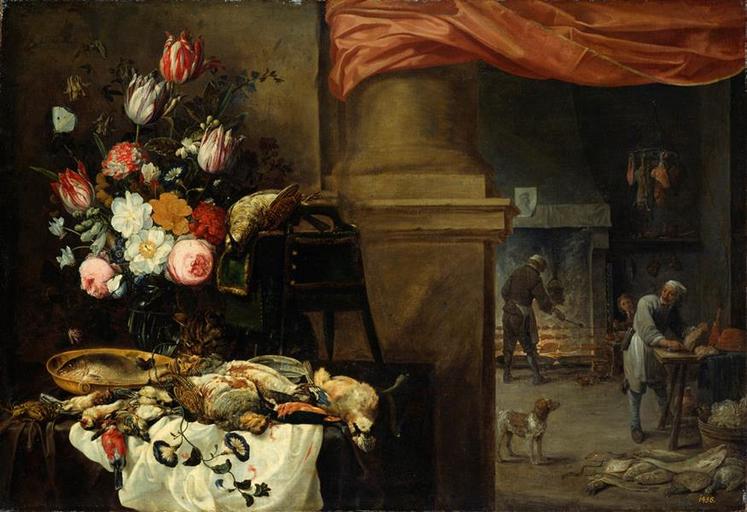 | Keywords: David Teniers (II), Nicolaes van Verendael, Carstian Luyckx - Kitchen still life with a vase of flowers, dead birds, a fish and a cat.jpg Artwork creator David Teniers II creator Nicolaes van Verendael Vase with flowers Creator Carstian Luyckx hunting still life bird cage dead fish and the cat on the left around the vase en Kitchen still life with a vase of flowers dead birds a fish and a cat circa 1670 /75 http //skd-online-collection skd museum/de/contents/showSearch id 408791 Oil canvas size cm 83 120 Institution Gemäldegalerie Alte Meister Dresden object history credit line signed upper left n v verendael f in brown signed lower right D T signed center carstian Lyckx on the bird cage accession number PD-old-100 Carstian Luyckx 01 Still-life paintings by Nicolaes van Verendael Kitchen interiors by David Teniers the Younger Flemish paintings in the Gemäldegalerie Alte Meister Dresden |