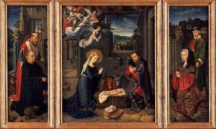 | Keywords: David Triptych with the Nativity.jpg Triptych with the Nativity Panel transferred to canvas 90 x 71 central 90 x 31 wings Metropolitan Museum of Art New York 1505-1515 http //www wga hu/html/d/david/1/index html Image from Web Gallery of Art<br> WGA has given permission for use of images on Wikipedia Public Domain PD-old-100 Nativity by Gerard David 1500s paintings in the Netherlands Triptychs in the Netherlands Images from Web Gallery of Art 16th-century paintings of the nativity of Jesus Christ 16th-century oil on panel paintings in the Netherlands Donor portraits with Nativity Ornamental textiles in art |