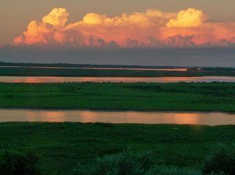 Keywords: dawn sunset river water field sky landscapes clouds sun twilight horizon light panoramic landscape green