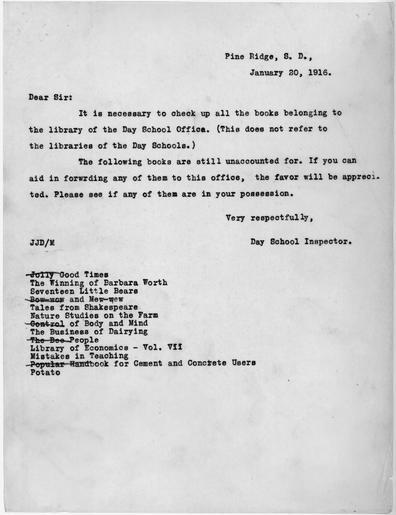 Keywords: Day School Inspector to Unknown Person. - NARA - 284898.tif Scope and content Concerning books belonging to the library of the Day School Office General notes 284898 Local identifier Department of the Interior Office of Indian Affairs Pine Ridge Agency 1878 - 09/17/1947 NARA's Central Plains Region Kansas City NREA 400 West Pershing Road Kansas City MO 64108 1916-01-20 Record group Record Group 75 Records of the Bureau of Indian Affairs 1793 - 1999 Record group ARC 404 Correspondence of the Day School Inspector J J Duncan compiled 02/09/1910 - 09/06/1916 Series ARC 283922 File unit Correspondence of Day School Inspector J J Duncan Jan 19 1916-Sept 6 1916 01/19/1916 - 09/06/1916 File unit ARC 284892 Variant control numbers NAIL Control Number NRE-75-169-K-6 yes Other versions NARA-cooperation PD-USGov Documents related to Pine Ridge Indian Reservation |