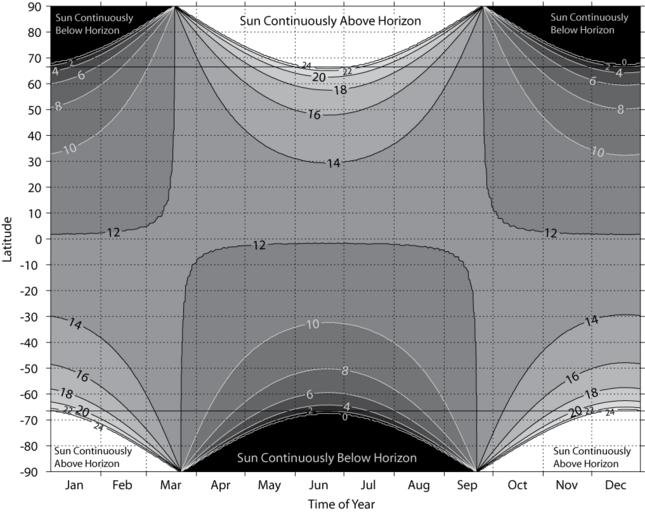 | Keywords: DayLength.png Length of day sunrise to sunset in hours as a function of latitude and time of year Sunrise and sunset times were calculated using the FORTRAN program sunae f found at ftp //climate1 gsfc nasa gov/wiscombe/Solar_Rad/SunAngles/sunae f Atmospheric refraction appropriate for the US Standard Atmosphere is applied at all latitudes though the correction should vary by latitude and time of year Contours are not necessarily smooth because of the 0 5-degree latitude spacing used in the calculations Calculations were performed for the 365 days in 2007 on the Greenwich Meridian For each minute during 2007 the sun's elevation the angle between a flat horizon and the apparent location of the center of the sun accounting for refraction was calculated at -90 -89 5 -89 89 5 and 90° latitude and 0° longitude The sunrise time was found by linearly interpolating to the time when the solar elevation was 0° going from negative to positive; the sunset time was found the same way but for the elevation going from positive to negative This ignores the fact that the diameter of the sun is about 0 5° meaning the top of the sun does not drop below the horizon until the solar elevation is -0 25° Ignoring the diameter of the sun slightly shortens the calculated length of the day but the difference is not significant when plotted on this scale Own 2007-09-05 StephenHudson SVG version available but it seems to load very slowly Image DayLength svg Day length |