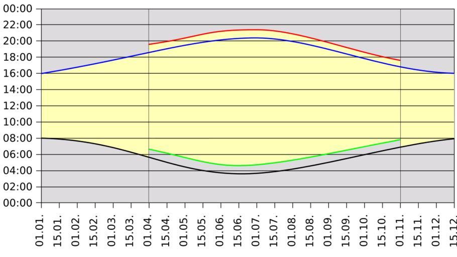 MAKE A MEME View Large Image Daylight Saving Time 1.svg Daylight Saving Time Sommerzeit Sonnenaufgangs- und Untergangszeiten bei Normalzeit und Sommerzeit; The chart plots the clock times with DST adjustment as separate lines of sunrise and sunset in Greenwich England ...