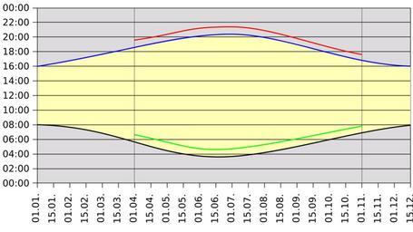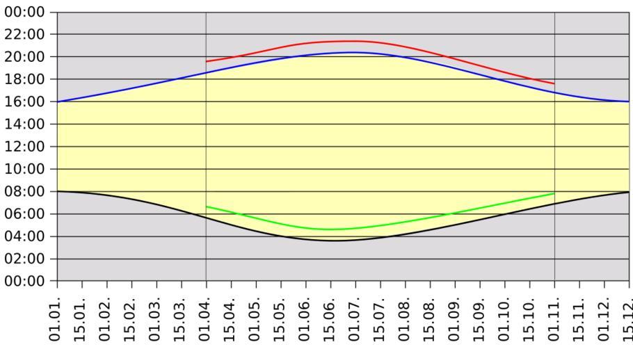 Keywords: Daylight Saving Time 3.svg Daylight Saving Time The chart plots the clock times with DST adjustment as separate lines of sunrise and sunset in Greenwich England for 2007 Durchgezogene Linie unten schwarz Uhrzeit des Sonnenaufgangs bei Normalzeit Durchgezogene Linie oben blau Uhrzeit des Sonnenuntergangs bei Normalzeit Kurze Linie unten grĂ¼n Uhrzeit des Sonnenaufgangs bei Sommerzeit Kurze Linie oben rot Uhrzeit des Sonnenuntergangs bei Sommerzeit alle Zeiten in Greenwich England 2007 Own 2008-04 Werneuchen Daylight saving time