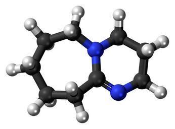 | Keywords: DBU-3D-balls.png Ball-and-stick model of the 1 8-Diazabicyclo<nowiki>5 4 0</nowiki>undec-7-ene molecule also known as DBU an amidine base used in organic synthesis Colour code 505050 Carbon C black<br> F0F0F0 Hydrogen H white<br> 3C50FA Nitrogen N blue<br> 2011-02-19 own DS Visualizer Jynto talk Space-filling version cc-zero Images by Jynto Ball-and-stick models DBU |