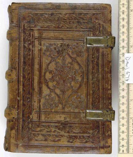 Keywords: De calamitatibus temporum -bound with two other texts- - Upper cover (Davis674).jpg Style Panel design Plant; Caption Upper cover; Colour Brown; Edge Plain exhibition history Decorative Technique Tooled in blind; Cover Material Sheep Wooden boards 2 pairs of brass clasps on leather thongs engraved with 'liber dni magri thilemann heuerlinck' Wooden boards with bevelled edges Three raised bands sewn on double thongs Different designs on upper and lower covers Macchi states; Bound in Rostock at the beginning of the 16th century object history Text 1499; Paris; Unspecified object type Cc-zero place of creation Binding Germany place of discovery See M M Foot The Henry Davis Gift vol II London 1983 See I Schunke Die Schwenke Sammlung p 245 Rostock n 5a Akadem Buchführer; p 249 n 13a Universitätsbuchbinder British Library image http //www bl uk/catalogues/bookbindings/LargeImage aspx RecordId 020-000004652 ImageId ImageId 41931 Copyright BL De calamitatibus temporum bound with two other texts Uploaded with GWToolset De calamitatibus temporum bound with two other texts - Upper cover Davis674 http //www webarchive org uk/bldatasets/bindings/6506_4 jpg Bookbinding 16th-century bookbinding British Library Bookbindings |