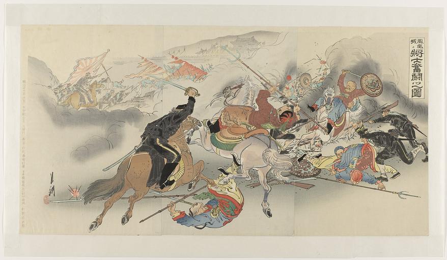 Keywords: De moeizame strijd bij Feng Huang Cheng-Rijksmuseum RP-P-2010-310-59.jpeg accession number RP-P-2010-310-59 Ogata GekkôOgata Gekkô died 1920; Matsuno Yonejirô credit line nl In een rokerig gevecht verslaan Japanse soldaten de Chinezen De echte slag was feitelijk ten noorden van de stad Feng Huang Cheng De Japanners waren van plan de stad over te nemen maar op 29 oktober 1894 verlieten de inwoners de stad en staken haar in brand De campagne in Mantsjoerije vond plaats in de maand oktober tijdens de Eerste Chinees-Japanse Oorlog 1894-1895 Label Line mentioned on object Ogata Gekkô 1859 - 1920 1894 kleurenhoutsnede; blinddruk; lijnblok in zwart met kleurblokken; polijsten Collection prenten; Japan collectie blad Height mm 371 Width mm 723 exhibition history paper object history Acquisition 2009-10-13 object type prent PD-US PD-old Data and photography rights All data and all images made available through the API are either in the public domain or are subject to a CC0 license https //www rijksmuseum nl/en/api/terms-and-conditions-of-use cc-zero place of creation Japan http //www rijksmuseum nl/collectie/RP-P-2010-310-59 http //hdl handle net/10934/RM0001 COLLECT 489990 handle De moeizame strijd bij Feng Huang Cheng Uploaded with GWToolset Rijksmuseum RP-P-2010-310-59 http //www rijksmuseum nl/media/assets/RP-P-2010-310-59 Images uploaded by Fæ Images from the Rijksmuseum Japanese 19th-century prints in the Rijksmuseum Amsterdam |