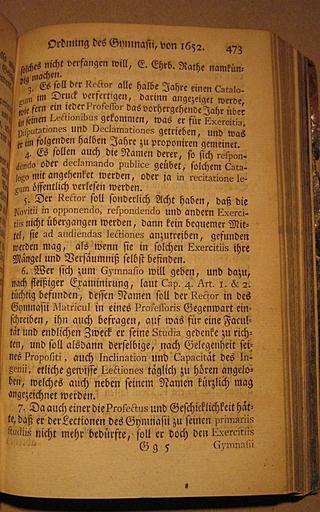 | Keywords: De Ordnung des Gymnasii 473.jpg De_Ordnung_des_Gymnasii_ jpg 472 474 This is a scan of the historical document with the title <br/> Ordnung des Gymnasii aus/ From Sammlung Hamburgischer Gesetze und Verfassungen Der Achte Theil Photo from original book 1770 Klefeker Johann Ed PD-old-100 De Ordnung des Gymnasii |