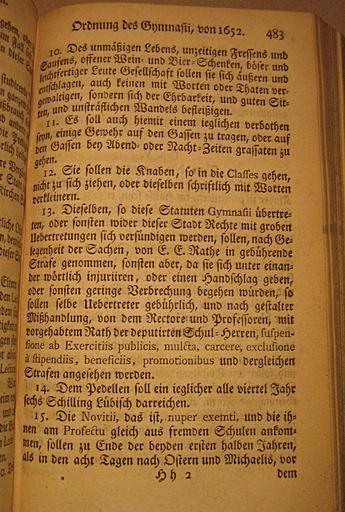 | Keywords: De Ordnung des Gymnasii 483.jpg De_Ordnung_des_Gymnasii_ jpg 482 484 This is a scan of the historical document with the title <br/> Ordnung des Gymnasii aus/ From Sammlung Hamburgischer Gesetze und Verfassungen Der Achte Theil Photo from original book 1770 Klefeker Johann Ed PD-old-100 De Ordnung des Gymnasii |