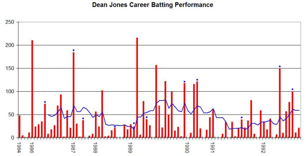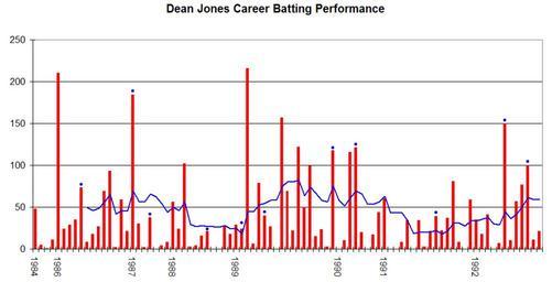 | Keywords: Dean Jones graph.png Test Match performance of Dean Jones It was created by Raven4x4x The red bars indicate the player's test match innings while the blue line shows the average of the ten most recent innings at that point Note that this average cannot be calculated for the first nine innings The blue dots indicate innings in which Jones finished not-out This graph was generated with Microsoft Excel 2002 using data from http //www cricinfo com/ Cricinfo and http //www howstat com au Howstat com au 2006-02-08 Own Raven4x4x wikipedia en Raven4x4x original upload log page en wikipedia Dean_Jones_graph png 2006-02-08 03 41 Raven4x4x 963×492 5950 bytes <nowiki>This graph details the Test Match performance of Dean Jones It was created by Raven4x4x The red bars indicate the player's test match innings while the blue line shows the Batting average</nowiki> DEFAULTSORT Jones Dean People of Melbourne Cricket coaches Derbyshire County Cricket Club cricketers Members of the Order of Australia Australia Test cricketers Durham County Cricket Club cricketers Wisden Cricket graphs |