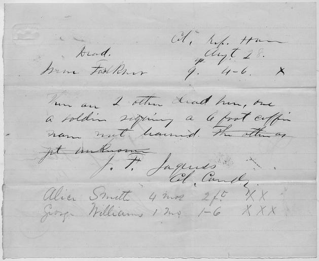 Keywords: Death and Interment Record for Falkner - NARA - 279484.tif Scope and content Status Contraband Death Date 08/28/0000 General notes Multiple List Age 9 Years First Name is illegible Also listed are Alice Smith and George Williams Note that only a portion of this document has been digitized and made available online 279484 Local identifier War Department Military Division of the Tennessee Department of Tennessee Post of Chattanooga Tennessee Quartermaster 1865 - 1866 NARA's Southeast Region Atlanta NRCA 5780 Jonesboro Road Morrow GA 30260 Record group Record Group 92 Records of the Office of the Quartermaster General 1774 - 1985 Record group ARC 421 Records of Death and Interment at Camp Nelson KY compiled 1864 - 1865 Series ARC 279423 File unit File unit ARC Variant control numbers NAIL Control Number NRCA-92-QMG003-67 yes Other versions NARA-cooperation PD-USGov Documents in English |